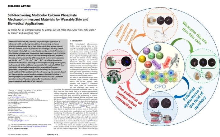 我校朝克夫教授團隊與深圳大學王瑀、彭登峰教授團隊合作開發出一類低成本、可多色發射、環境友好且生物兼容的Ca?P?O?基應力發光材料。該系列材料可在紫外至紅光的寬光譜范圍內發光,并在多次機械加載循環中保持穩定的發光強度與自恢復特性。研究利用第一性原理計算發現,該材料的縱向壓電系數d??高達24.90 pc/N,結合實驗驗證,揭示了其應力發光機理為內建壓電場與外部摩擦電場協同作用的結果。由于其發光強度與機械應力呈線性關系,該材料在應力傳感和運動監測中具有重要應用價值。團隊將Ca?P?O?: X材料與柔性聚二甲基硅氧烷(PDMS)、環氧樹脂以及仿真牙科材料相結合,成功制備了多種柔性可穿戴傳感器與生物器件原型。在人體接觸與人工唾液浸泡30天的生物安全性測試中,僅檢測到少量Ca、P元素,未檢出有害元素,進一步證明了其在可穿戴皮膚、運動防護及口腔修復等生物醫療場景中的應用前景。