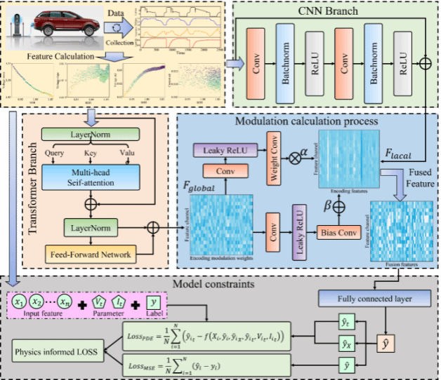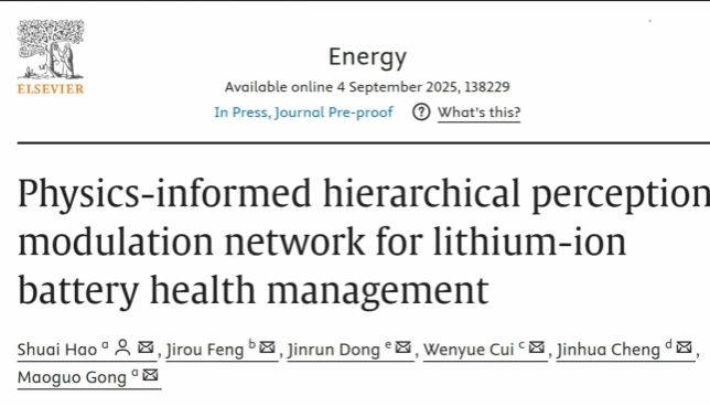 團(tuán)隊(duì)成員郝帥博士在能源領(lǐng)域的一區(qū)Top期刊《Energy》上發(fā)表題為《Physics-informed Hierarchical Perception Modulation Network for Lithium-ion Battery Health Management》的研究成果。該研究圍繞復(fù)雜工況下電池健康狀態(tài)評(píng)估準(zhǔn)確性與魯棒性難題,提出了物理約束層次感知調(diào)制網(wǎng)絡(luò),實(shí)現(xiàn)了對(duì)電池退化動(dòng)力學(xué)的精準(zhǔn)建模與電池健康狀態(tài)高精度預(yù)測(cè),在多變溫度、載荷與充放電策略條件下表現(xiàn)出更強(qiáng)的泛化能力與穩(wěn)定性。該方法實(shí)現(xiàn)了雙分支協(xié)同框架,局部分支采用卷積神經(jīng)網(wǎng)絡(luò)提取細(xì)粒度電化學(xué)表征,捕獲循環(huán)內(nèi)快速變化的微結(jié)構(gòu)信息;全局分支引入Transformer建模長(zhǎng)程時(shí)序依賴,刻畫跨循環(huán)的容量衰退軌跡。兩分支通過“退化感知”調(diào)制機(jī)制耦合,使全局退化上下文自適應(yīng)調(diào)制局部特征提取,動(dòng)態(tài)平衡局部敏感性與全局一致性。同時(shí)設(shè)計(jì)物理約束損失,將離散狀態(tài)空間退化方程嵌入學(xué)習(xí)過程,以物理先驗(yàn)規(guī)范參數(shù)更新,減輕僅憑數(shù)據(jù)驅(qū)動(dòng)帶來的不確定性。經(jīng)過系統(tǒng)評(píng)測(cè),物理約束層次感知調(diào)制網(wǎng)絡(luò)在預(yù)測(cè)精度與跨工況泛化方面均優(yōu)于現(xiàn)有代表性方法,有限數(shù)據(jù)場(chǎng)景下仍保持穩(wěn)健表現(xiàn)。該成果為電動(dòng)汽車電池管理系統(tǒng)提供可落地的電池健康狀態(tài)在線估計(jì)方案,可服務(wù)車輛安全預(yù)警與運(yùn)維決策,并對(duì)儲(chǔ)能系統(tǒng)壽命評(píng)估、預(yù)測(cè)性維護(hù)等應(yīng)用具有重要價(jià)值。
