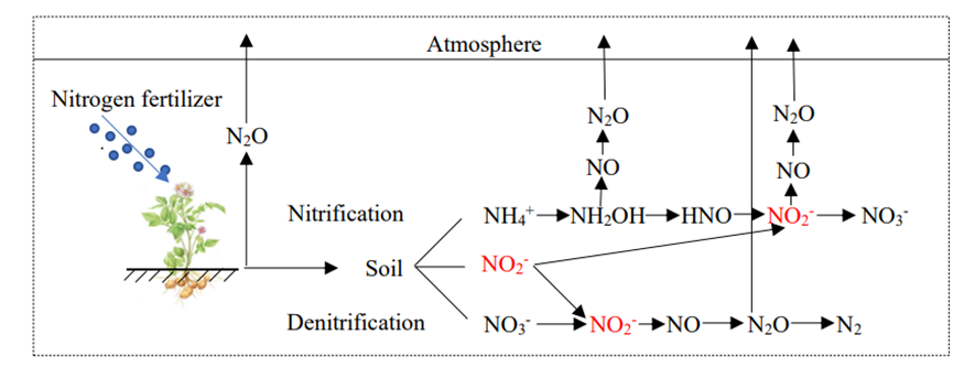 焦燕教授領銜的“陸地生態(tài)系統(tǒng)碳氮循環(huán)與全球變化團隊”一直致力于灌溉生產方式調控土壤氮肥運移機制方面的研究。近期,通過研究灌溉和施肥方式對土壤氮肥時空分布和去向的影響發(fā)現(xiàn),土壤氮肥在NH4+-NO2--NO3--N2O遷移轉化過程中,NO2-在氮肥N2O排放損失中起到至關重要作用,氮肥損失主要發(fā)生在馬鈴薯塊莖形成期和膨大期,農田土壤氮肥N2O排放損失可以通過滴灌施肥模式調控,為保護大氣環(huán)境提供了切實可行的措施。其研究成果“Mechanisms underlying nitrous oxide emissions and nitrogen leaching from potato fields under drip irrigation and furrow irrigation”在水資源領域TOP期刊《Agricultural Water Management》上發(fā)表。