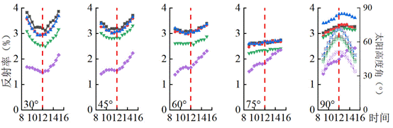 該研究通過(guò)分析多角度觀測(cè)數(shù)據(jù),深入探究了荒漠草原在不同時(shí)間尺度和觀測(cè)角度下的光譜特征,并分析其光譜變化趨勢(shì)和差異性。結(jié)果如圖2所示,隨著傳感器觀測(cè)高度角的增加,觀測(cè)反射率日變化幅度逐步減?。划?dāng)觀測(cè)高度角達(dá)到90°時(shí),反射率日變化與太陽(yáng)高度角變化趨勢(shì)一致,而傾斜角度觀測(cè)則與之相反。該設(shè)備所獲取的數(shù)據(jù)具有真實(shí)性、長(zhǎng)期性、連續(xù)性等特點(diǎn),可以準(zhǔn)確理解植被在不同波段下的光譜特征變化,以及不同植被指數(shù)對(duì)觀測(cè)角度的響應(yīng)程度,進(jìn)而提高遙感監(jiān)測(cè)效果,拓展其應(yīng)用領(lǐng)域。
