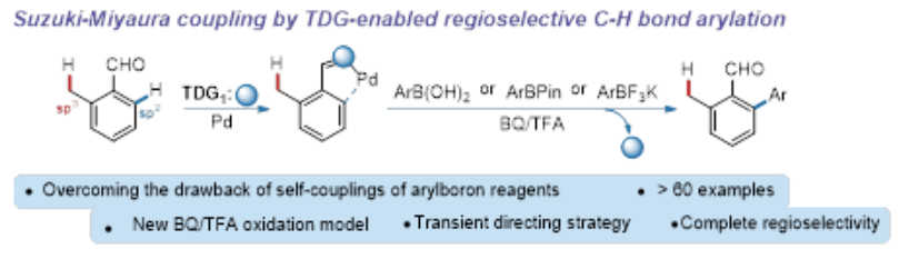 聯(lián)苯類化合物作為一種重要的結(jié)構(gòu)單元,被廣泛應(yīng)用于醫(yī)藥、有機(jī)光伏、有機(jī)發(fā)光二極管、有機(jī)場(chǎng)效應(yīng)晶體管中。由于芳環(huán)C-H鍵的芳基化反應(yīng)是合成聯(lián)苯類化合物最直接有效、環(huán)境友好的方法,所以在近年來(lái)獲得了廣泛發(fā)展。但是,這些反應(yīng)都需要使用鹵苯作為芳基化試劑,并且往往需要昂貴的銀鹽作為鹵素移除劑,所生成的鹵化銀會(huì)對(duì)環(huán)境造成一定程度的污染。2006年,余金泉課題組報(bào)道了首例芳環(huán)C-H鍵與有機(jī)硼化合物的偶聯(lián)反應(yīng)。然而,由于芳基硼化合物非常容易發(fā)生自偶聯(lián)反應(yīng),導(dǎo)致這種鈴木-宮浦型C-H鍵芳基化反應(yīng)發(fā)展緩慢。